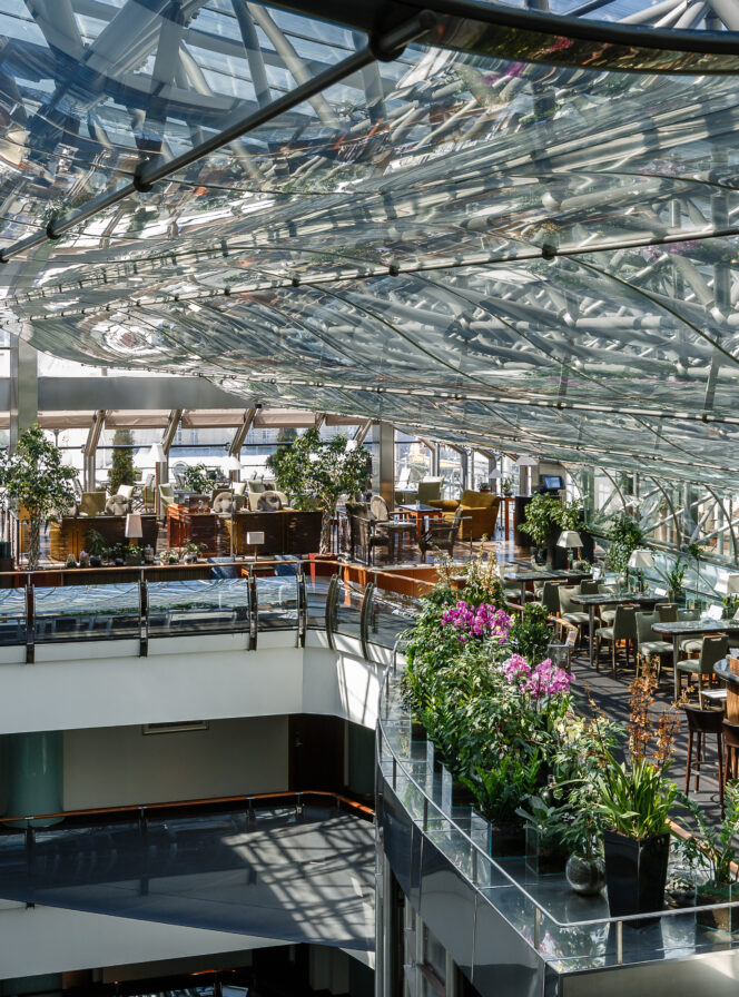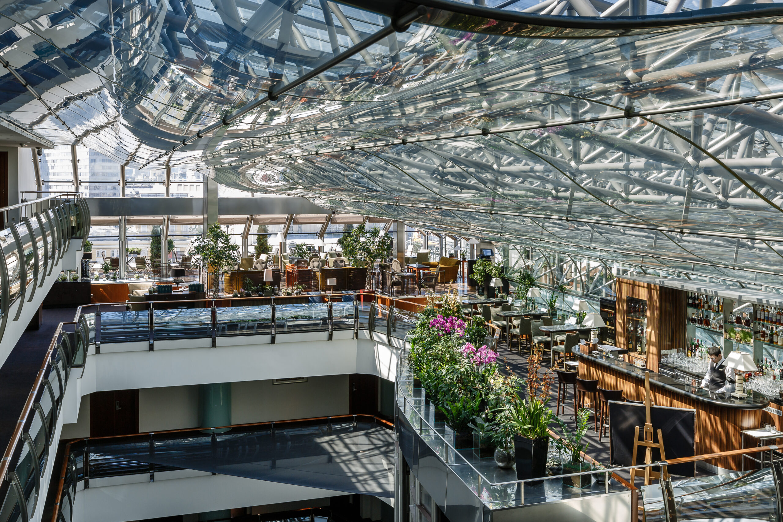 Панорамный ресторан и бар на десятом этаже «Арарат Парк Хаятт». И если «Арарат» — это концентрат покоя, заботы и предвкушений чего-то интересного, что сулит столица, то в баре «Консерватория» это интересное уже вовсю начинается. Заходят сюда не только постояльцы – это давно вписанные в городские будни и праздники бар, где хорошо гулять на вечеринках, или сидеть наедине с коктейлем и медитативно смотреть на город.